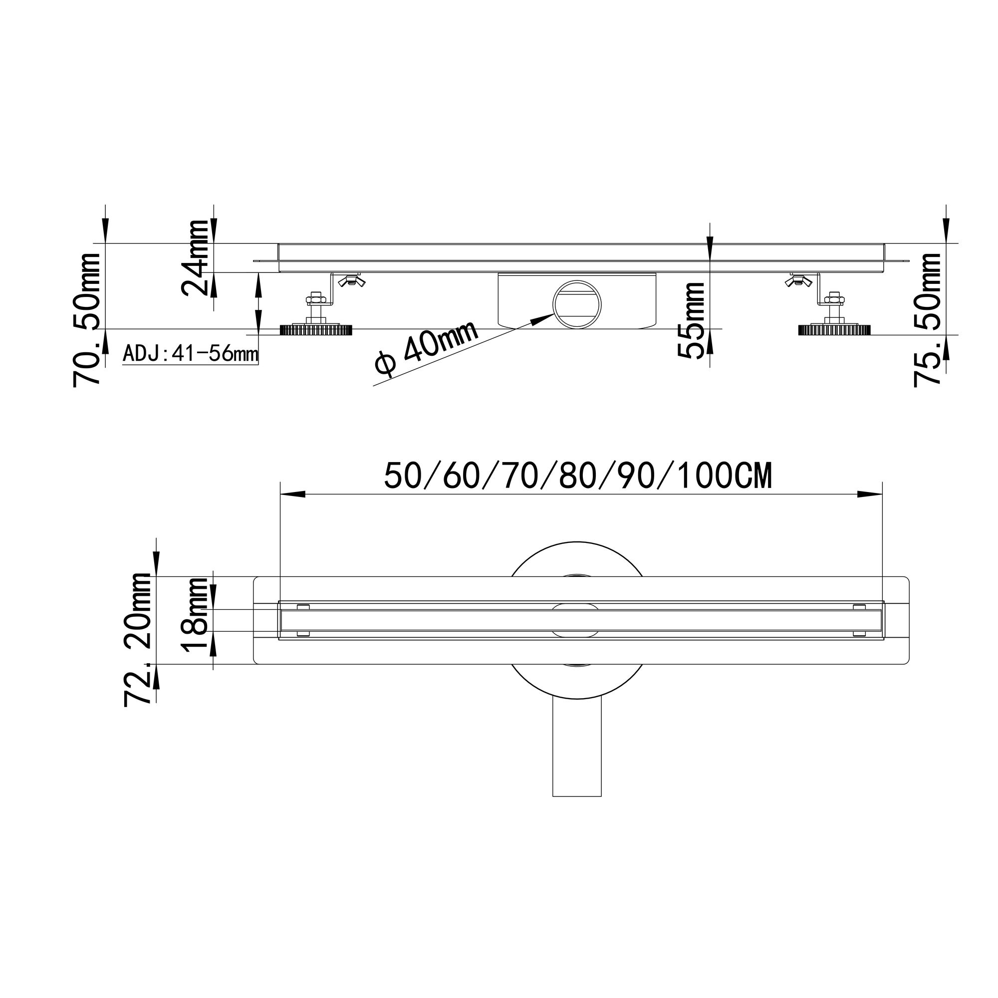 Die flache Duschrinne B8 ist flexibel einsetzbar und lässt sich durch ihre Höhenverstellung von 68 mm bis 80 mm optimal anpassen. Sie ist in verschiedenen Längen erhältlich:
